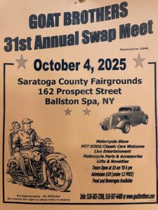 Saturday October 4 — 31st annual GOAT Brothers Swap Meet. 10a – 6p Saratoga County Fairgrounds, Ballston Spa.