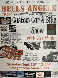 Saturday September 20 — Hells Angels Troy Custom Car & Bike Show. Noon – 8P, Schaghticoke Fairgrounds.
